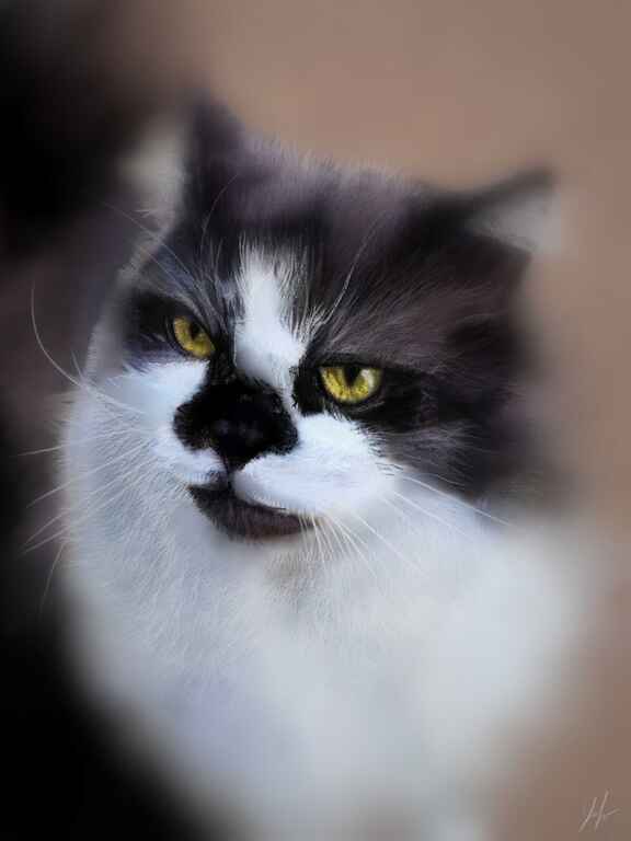 A portrait of a recently passed cat of my girlfriends parents. This took quite a while to get the proportions and the colouring correct. The final touch of a vignette blur worked pretty well which gave the depth of view and brought the focus to the face. I enhanced the eyes with a sparkle which didn't exist in the original reference and of course needed to remember to add in the whiskers.