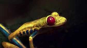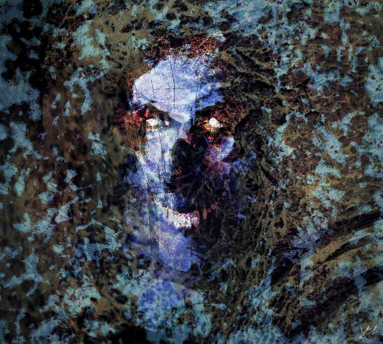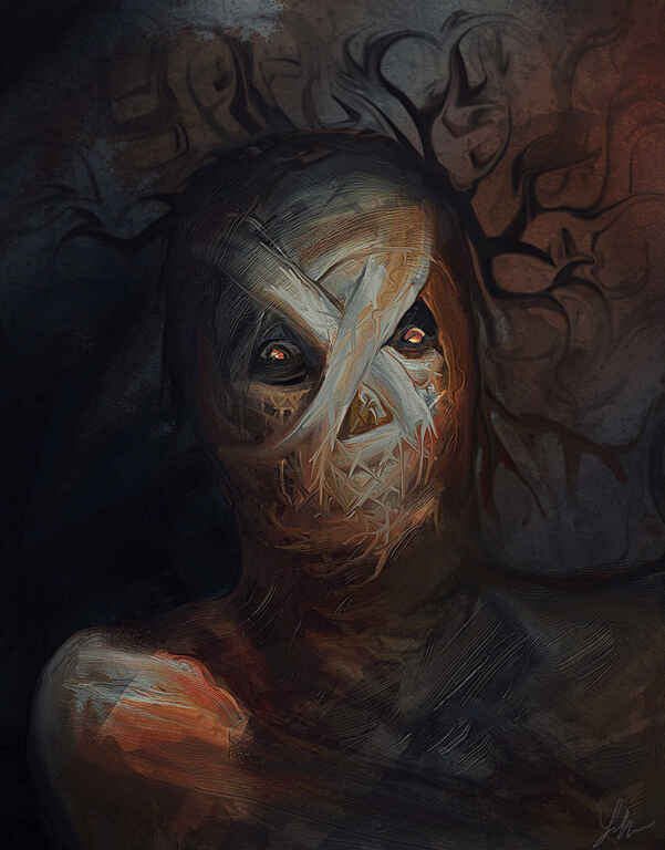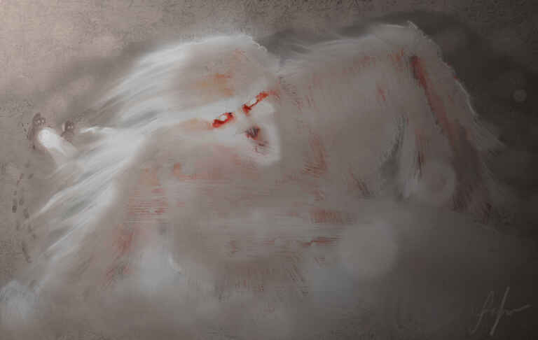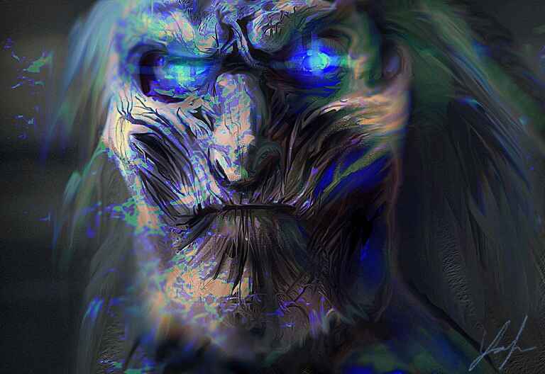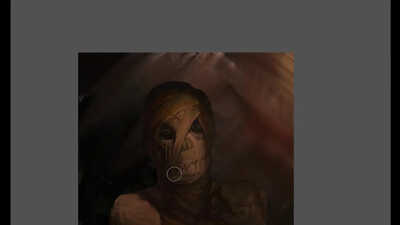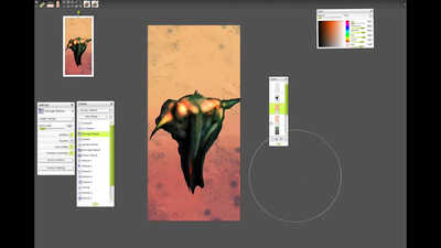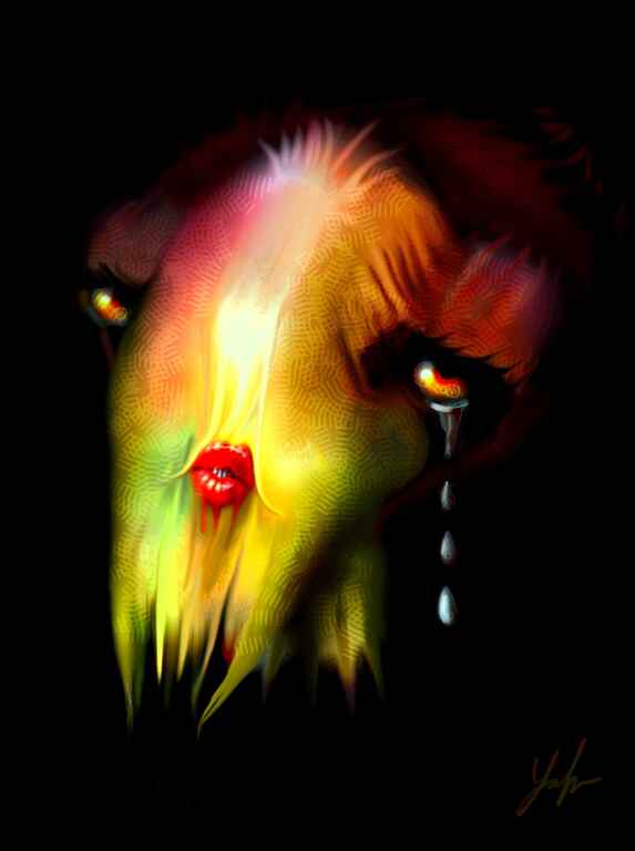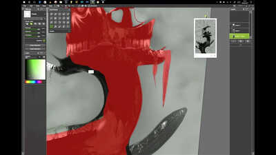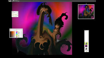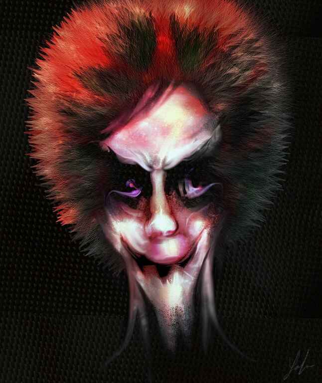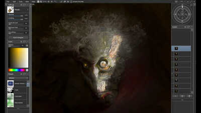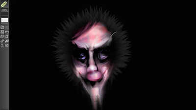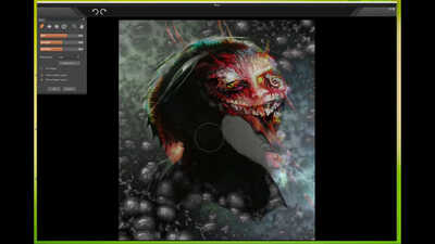 I wanted this creature to look sinister in a very creepy way and to almost have a spiders eyes, the fur brushes were extensively used here to achieve an animal effect. I couldn't quite work out what to do with the body so I just cut it off, which I'm not quite sure worked too well. You will also notice a common background that I often apply from the default ArtRage texture section.