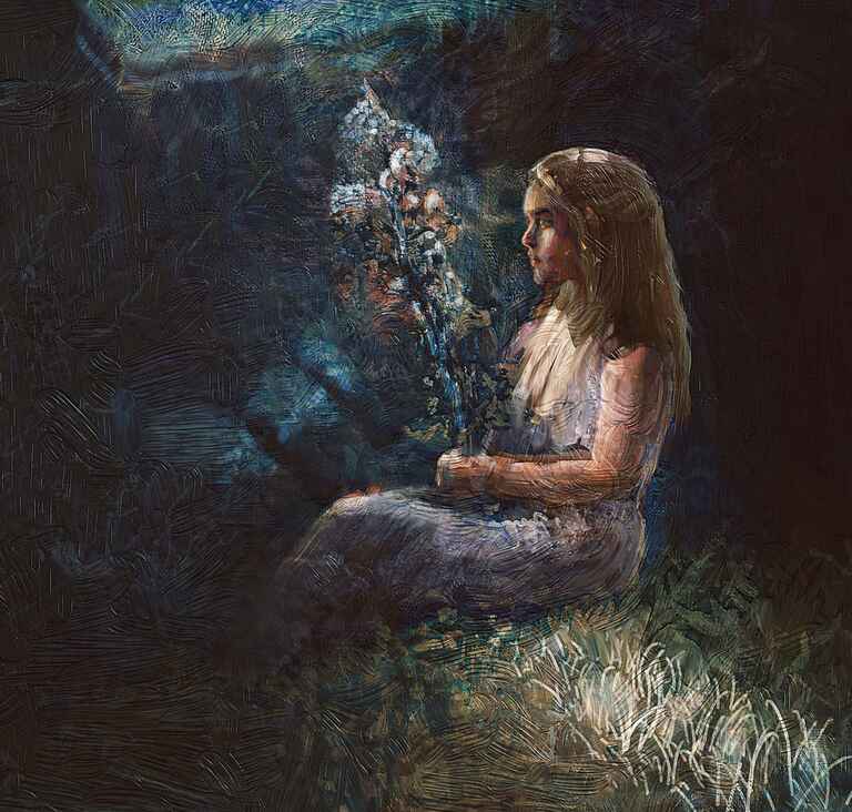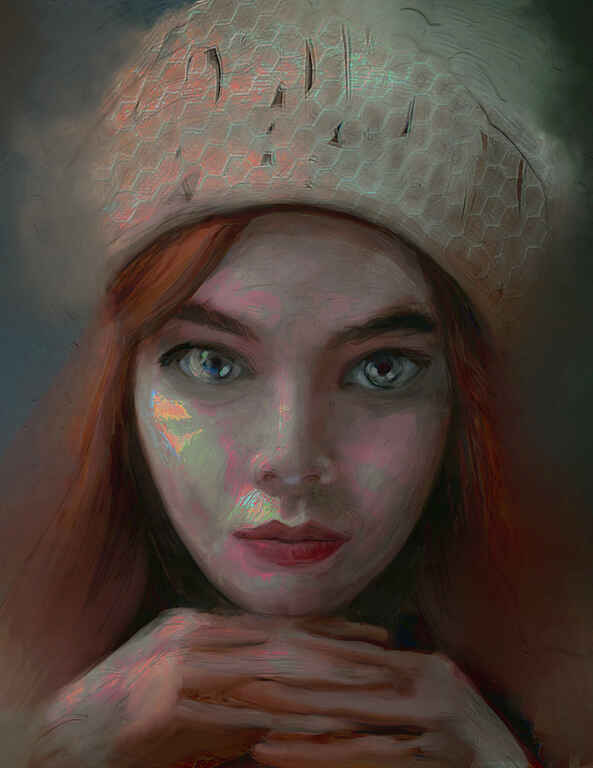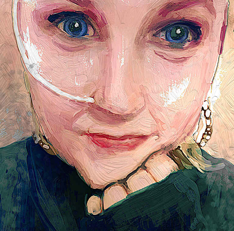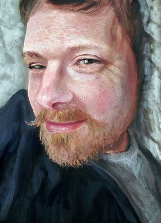 A very straightforward portrait, although the pose with a hand fully visible was quite challenging. I focussed on quite a watered down oil brush for an oil glazing effect to build up the colour.