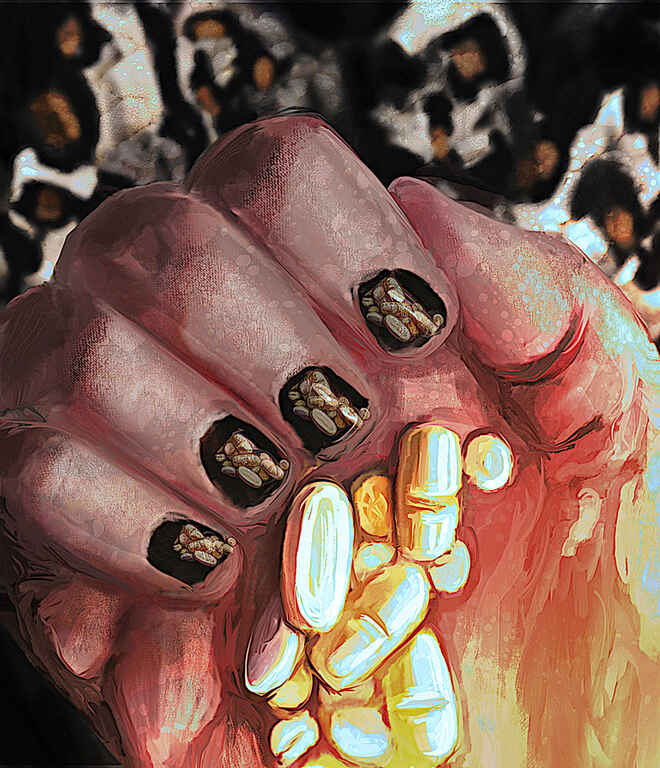 Starting with a reference of my mum and then improvising the rest, I made a little use of a button stencil to define the moon in the background.