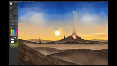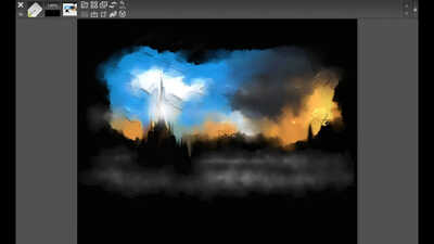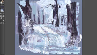 A landscape using mainly the oil brush!, I had fun with this one balancing the tones and contrast and just plain making things up, I think I was channelling Bob Ross a little on this one.